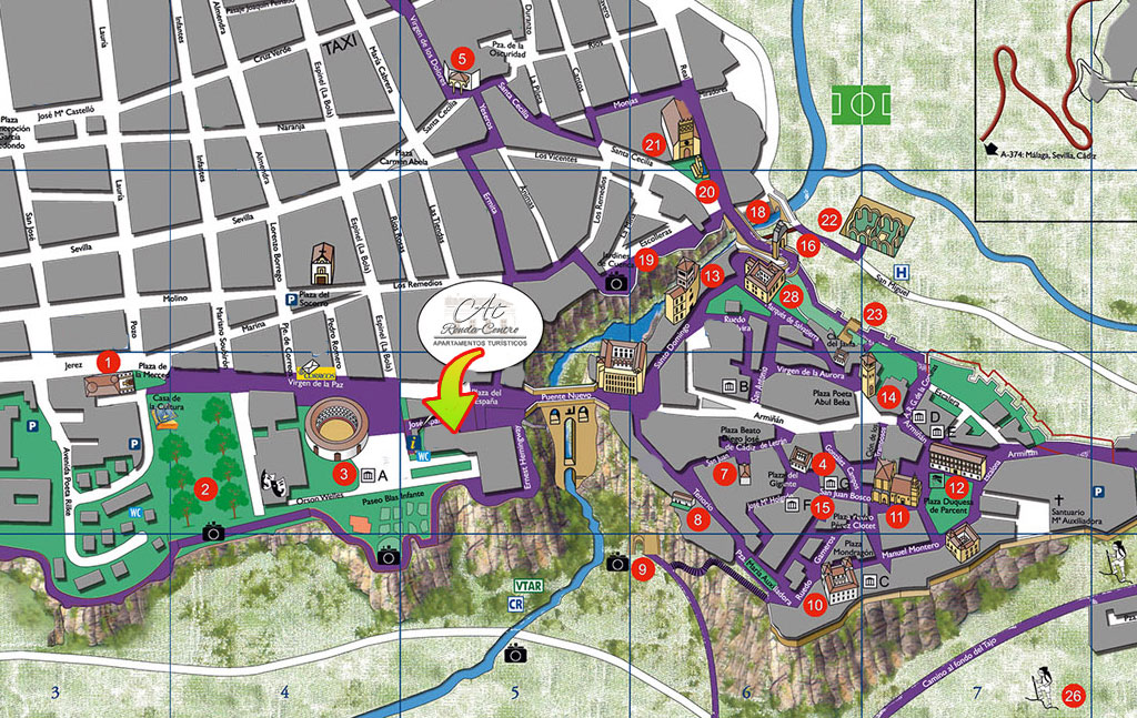 Nuestros apartamentos se encuentran justo en el Centro de Ronda. La plaza de España está en un extremo del famoso Puente Nuevo y en ella también se encuentra el Parador de Turismo de Ronda. La zona alrededor de los Apartamentos es peatonal y está rodeada de restaurantes y comercios de todo tipo. La Plaza de Toros y la Alameda están a un minuto andando. Para visitar la zona monumental del casco antiguo de Ronda no tiene más que cruzar el Puente.